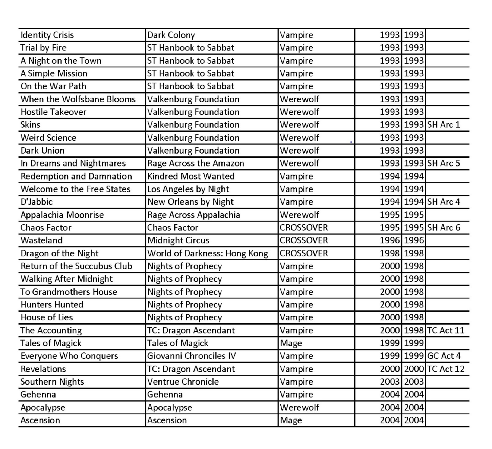 First, I'm clearly missing a few adventures. Possibly quite a few. My main source was the fan-based White Wolf Wiki and I know for a fact they were missing some. Unfortunately, I couldn't find anything close to a better source. Even drivethrurpg didn't come close to the Wiki as far as showing what adventures were in which book. If you see any glaring holes, please let me know.