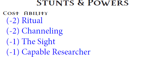 As a Focused Practitioner, I must take either Channeling (immediate spells) or Ritual (takes longer, but has a greater effect), each costs 2 of her Refresh. I decide to go with both. I also decide to take the Sight, which allows her to see the dead that walk among us. All of this costs her 5 Refresh.